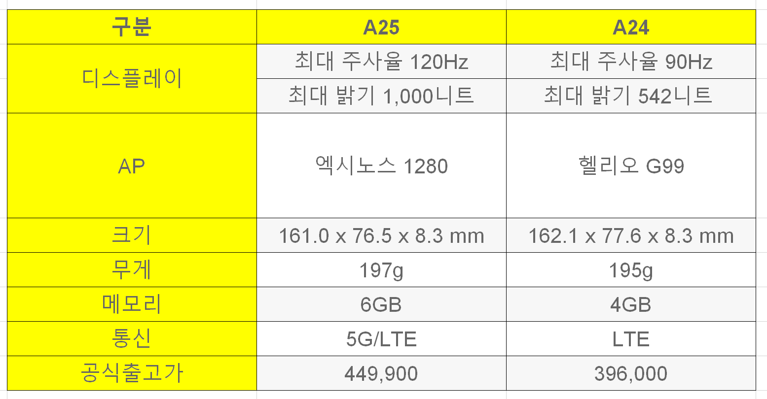 갤럭시 a25 스펙 - a25 와 a24 비교